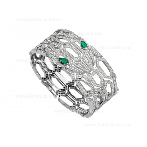Bracelet jonc Bvlgari Serpenti en or blanc 18 carats serti d'yeux émeraude et de diamants entièrement pavés