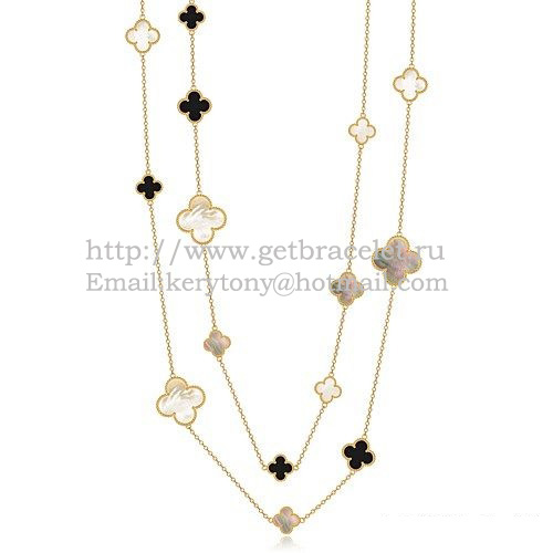 Les créations Magic Alhambra, nées en 2006, regroupent des Alhambra de différentes tailles. Van Cleef & Arpels Magic Alhambra série fantastique par des changements dans la taille de Van Cleef & Motif classique Arpels, exploration audacieuse du design asymétrique, motif transformé en ornements hautement poétiques. Six sortes de motifs de calcédoine et de nacre avec contour doré créent ce collier élégant et accrocheur. Longueur : 120 cm.